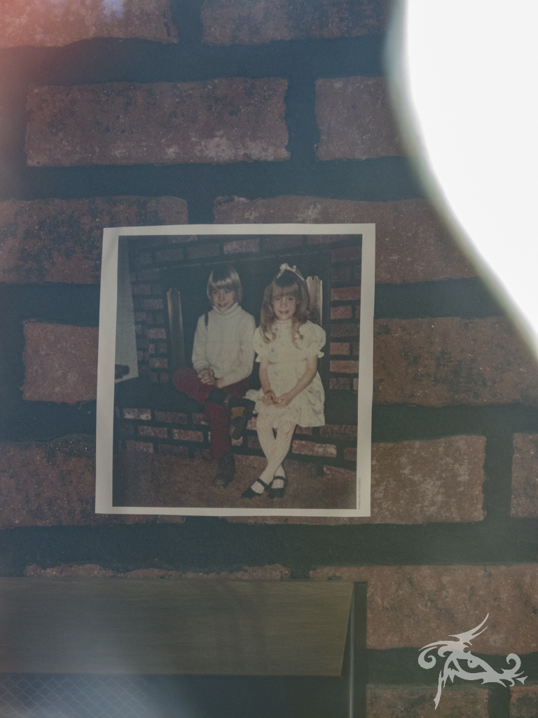 Am Wohnzimmerfenster im Erdgeschoss ist die Gardinen einen Spalt offen. Das einfach verglaste Fenster ist sehr schmutzig, aber man kann etwas erkennen. Teppich, Wand, Kamin – alles im 1960er Style und auch so alt. Über diese verbrauchten Fasern krabbelte schon Klein Kurt. Und an diesem Kaminsims dort saß er mit seiner Schwester und posierte für ein Foto. Das klebt als „Beweis“ am Kamin. Es sieht ein wenig aufgesetzt aus – als hätte der Makler es angebracht. „Seht her, genau hier war es!“ Auch in weitere Räume kann man von außen einen Blick durchs Fenster erhaschen. Das Elternschlafzimmer etwa oder das Kinderzimmer von Kurts Schwester mit verblichener Luftballon-Tapete.