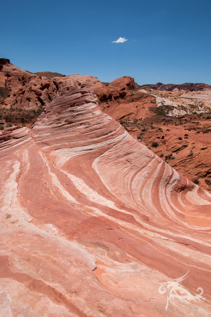 Auf diese Weise erreichen wir irgendwann Parkplatz Nr. 3, den Ausgangspunkt zur Fire Wave. Die können wir uns natürlich nicht entgehen lassen, Hitze hin, Hitze her. Also mit Sonnencreme einbalsamiert, Kappe und Sonnenbrille an und ab dafür. Der Reiseführer beschreibt die Strecke mitten durch die Sand- und Felswüste recht gut und spricht von einer kurzen Distanz von etwa 1,2 Kilometern. „In zehn Minuten sind wir da“, denk ich noch, als wir los stiefeln. Aber über Stock und Stein und nach ein bisschen verirrtem Suchen wird es dann doch eine halbe Stunde. Die mitgenommene Flasche Wasser wurde schon fast ganz geopfert, als wir endlich da sind und dieses irre Naturwunder genießen können. Wobei, genießen … Auf dem blanken Stein sind es gefühlt 50°C und wir machen uns schon nach einer Viertelstunde wieder auf den Rückweg. Der dauert aber ein bisschen länger, da wir eine vermeintliche Abkürzung zum Parkplatz entdeckt haben, die nicht wirklich eine ist und wir uns auch noch leicht verfransen. Das reicht dann für heute aber auch mit „Wandern“. Nach einer Flasche Wassser auf Ex fahren wir den Rest des Parks noch ab. Wirklich schön hier, aber gemessen an all der atemberaubender Natur der letzten Tage war er nicht das Highlight.