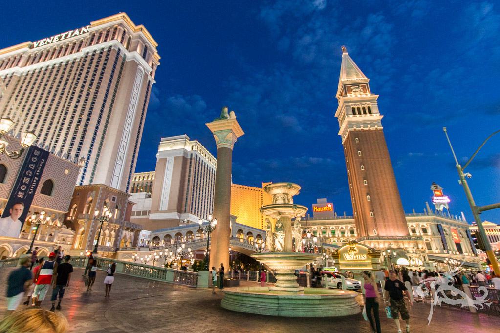 Aber erst mal Abendessen fassen. Gleich gegenüber dem Treasure Island entern wir den ersten „Denny’s“ überhaupt und schließen gleich Freundschaft mit diesem Denny. Gutes Futter, gute Preise, Refill-Cups und hier auch noch eine tolle Aussicht auf den Strip. Einen Mega-Burger später geht die Sonne schon unter und wir in das Venetian. „Schock“ Nummer Zwei folgt. Man ist ja durch Reiseberichte und Fotos etwas vorgewarnt, aber wenn man die Gigantomanie live vor Ort sieht, ist das doch immer noch etwas anderes. Die haben den Canale Grande in (!) das Hotel (!) verlegt! Auch hier dämmert es auf dem riesigen großen Marktplatz mit Kopfsteinpflaster im (!) Hotel am Canale Grande und es ist einfach unglaublich. Ein kurzer Blick ins Casino läßt nicht nur mein kleines, stark vernachlässigtes Spielerherz hüpfen, sondern macht einem noch einmal klar, wie riesig das alles ist hier.